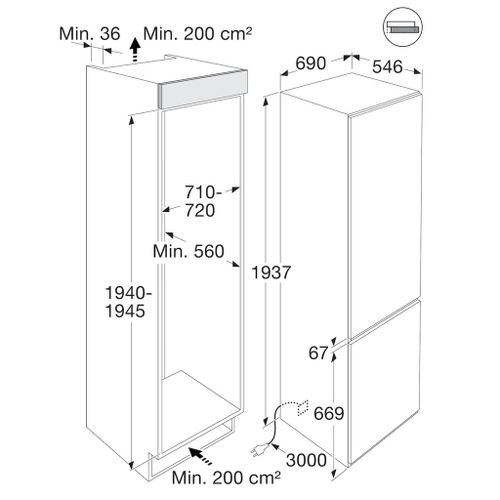 Inbouw koelvrieskast 194 x 70 cm - Combi, D label, 35 dB, 370 L, DuraFresh - TFT display - Sleepdeur Productinformatieblad - pdf Energielabel - pdf