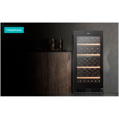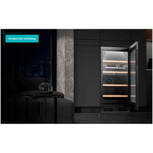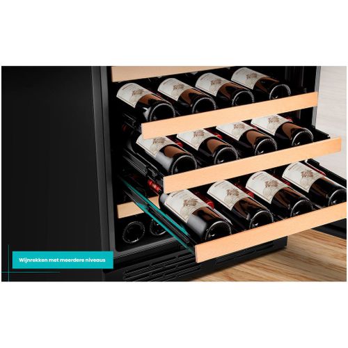Met een totale capaciteit van 239 liter biedt deze wijnklimaatkast ruimte aan 108 flessen (0,75 l Bordeaux). De vier beukenhouten legplateaus zijn uitschuifbaar, waardoor je gemakkelijk toegang hebt tot je wijncollectie.