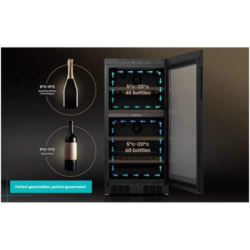 De WKV584 beschikt over twee afzonderlijke temperatuurzones die instelbaar zijn tussen 5°C en 20°C. Hierdoor kun je rode en witte wijnen onder ideale omstandigheden bewaren, wat de smaak en kwaliteit ten goede komt.