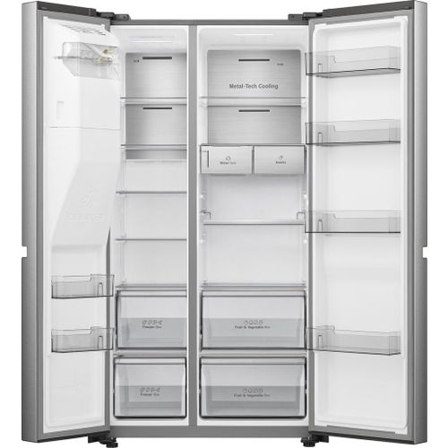 XDe Hisense RS818N4TIC Amerikaanse koelkast heeft een netto inhoud van 632 liter, en biedt daardoor veel ruimte voor het bewaren van etenswaren. Daarvan neemt het koelgedeelte 417 liter in en het vriesgedeelte 215 liter. De Amerikaanse koelkast is 179,5 cm hoog en heeft een breedte van 91 cm, met ee...
