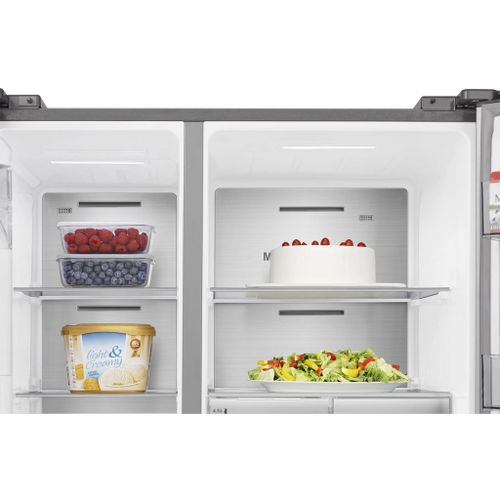De Hisense RS818N4TIC Amerikaanse koelkast heeft een netto inhoud van 632 liter, en biedt daardoor veel ruimte voor het bewaren van etenswaren. Daarvan neemt het koelgedeelte 417 liter in en het vriesgedeelte 215 liter. De Amerikaanse koelkast is 179,5 cm hoog en heeft een breedte van 91 cm, met een diepte van 73 cm. Deze koelkast heeft energielabel C. Het apparaat is voorzien van no frost zodat je het vriesgedeelte nooit hoeft te ontdooien.
