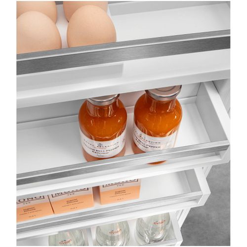 Nooit meer ontdooienDeze koel/vriescombinatie met 4 vriesladen uit de Pure-serie voorziet in alle essentiële behoeften. In de EasyFresh lade bewaart u groenten en fruit bij de ideale luchtvochtigheid. Het ruime koeldeel wordt dankzij de LED plafondverlichting goed verlicht. Het FreshAir filter zorgt voor een fris interieur en het NoFrost vriesdeel hoeft u nooit te ontdooien. Volledig vlakke deuren met geïntegreerde grepen over de volledige deurhoogte. Geschikt voor smarthome toepassingen dankzij optionele SmartDeviceBox.
