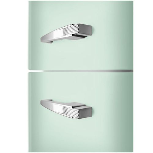De pastelgroene afwerking geeft de koelkast een unieke en zachte uitstraling, passend in zowel moderne als klassieke keukens. De afgeronde hoeken en chromen handgreep versterken de retrolook.